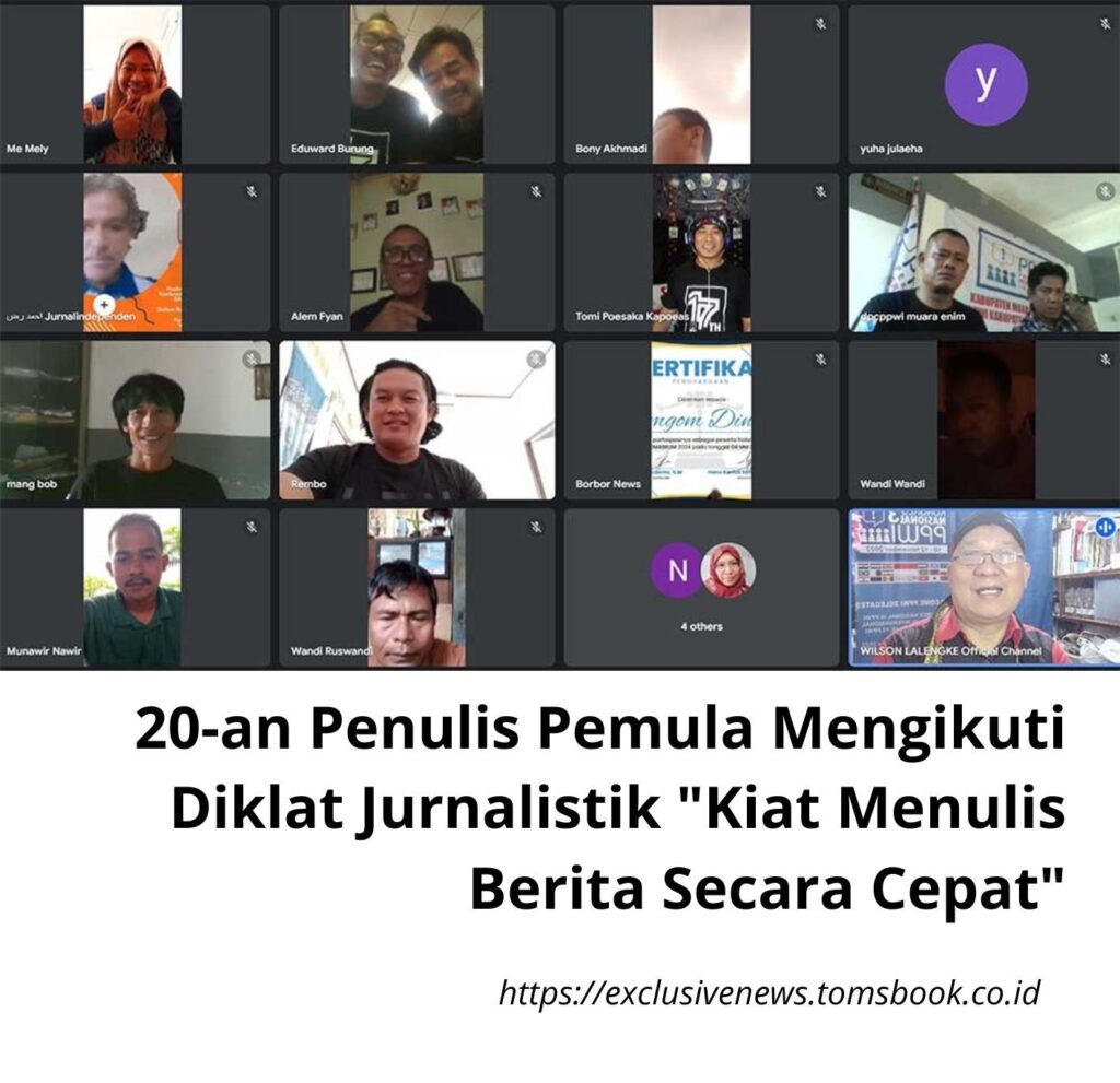 Tom’S Book, Sanggau – Dalam rangka meningkatkan keterampilan jurnalistik, Persatuan Pewarta Warga Indonesia (PPWI) Nasional menggelar diklat jurnalistik untuk penulis pemula, the Newbie alias pendatang baru di dunia tulis-menulis dan publikasi media massa dengan materi “Kiat Menulis Berita secara Cepat (Quick News)”. Kegiatan tersebut dilaksanakan di Ruang Belajar Jurnalisme Warga melalui kelas online (Google meet) https://meet.google.com/axk-ugxt-fme, pada Sabtu, 23 November 2024, pukul 09.00 – 12.00 wib, diikuti oleh 20-an Penulis Pemula dari berbagai daerah di Indonesia.