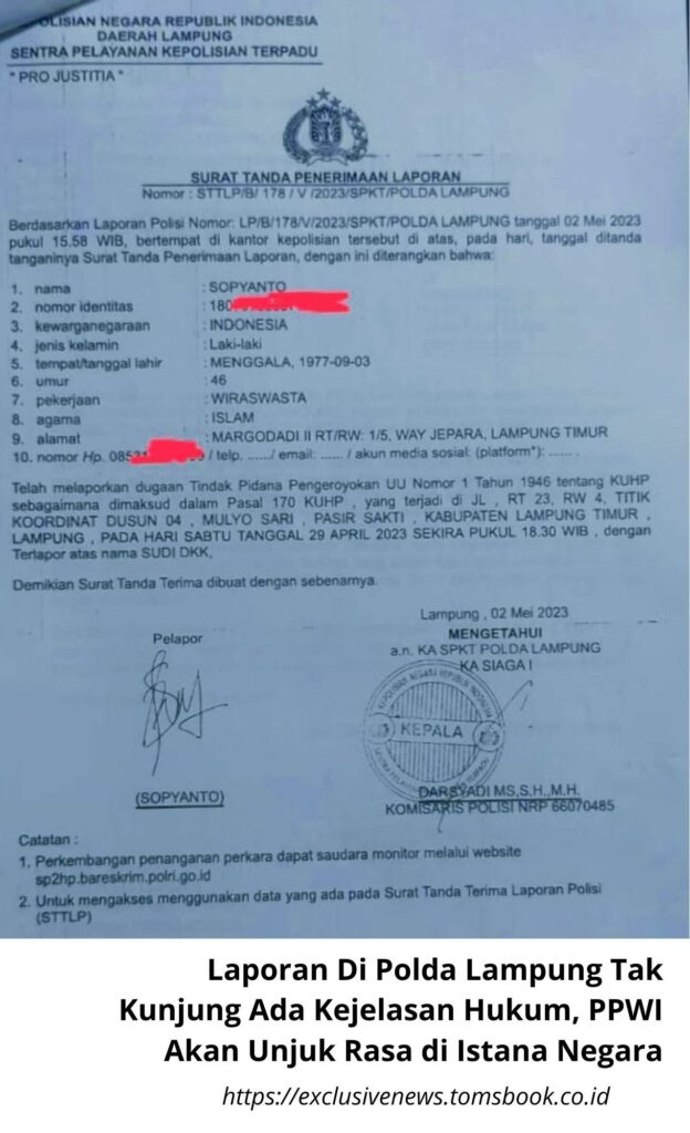 “Kami selaku Kuasa Hukum dari PPWI sangat prihatin dengan kinerja penyidik Polda Lampung sudah hampir 2 tahun laporan digantung,” ucap Ujang Kosasih. (Tim)